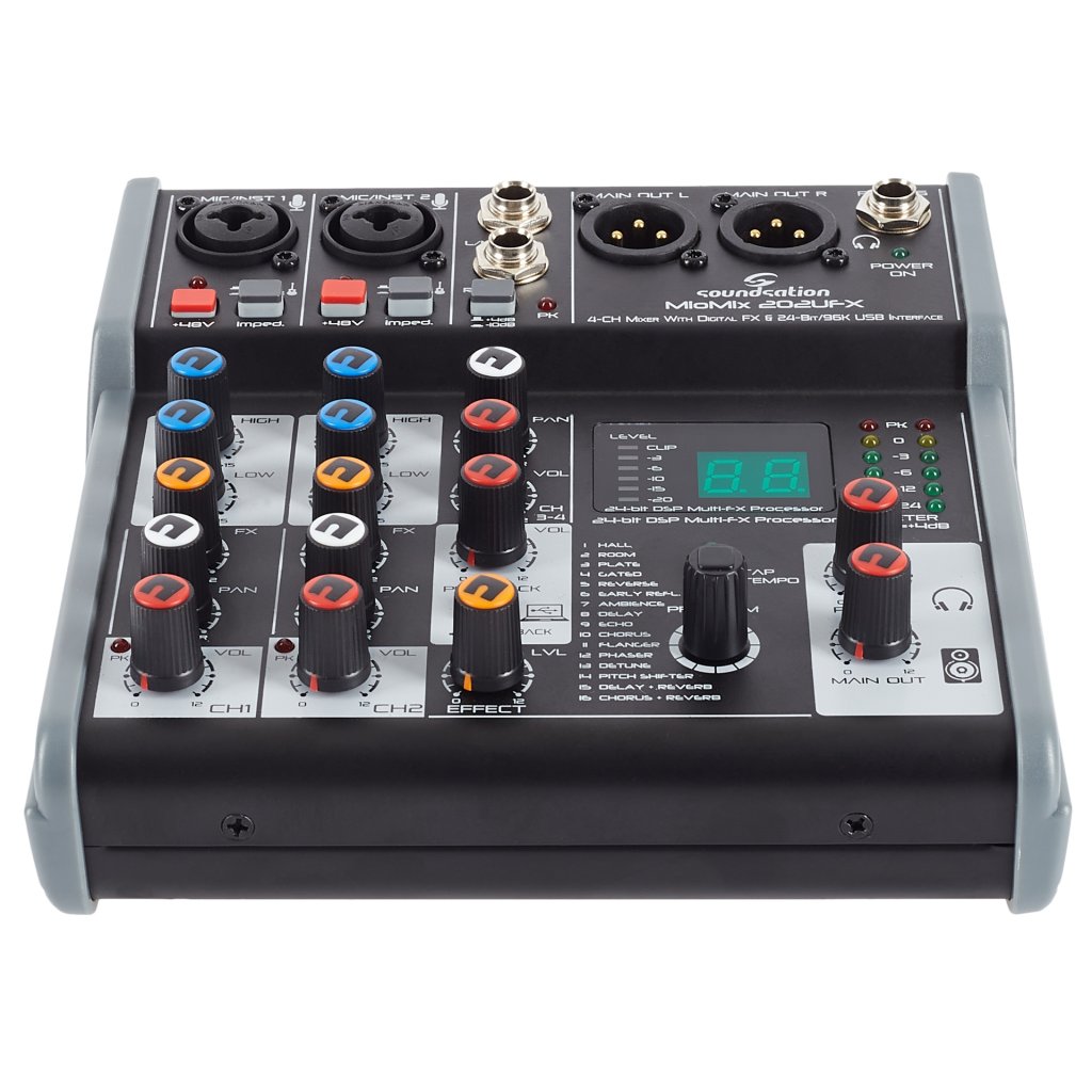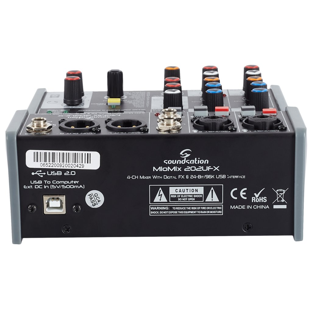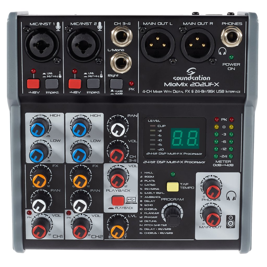 Miomix 202UFX je štvorkanálový mixážny pult s dvoma kombinovanými vstupmi XLR/TRS (tu môžete pripojiť mikrofóny, elektrifikované nástroje alebo linkové signály), dvoma linkovými vstupmi, dvoma výstupmi XLR do PA, slúchadlovým výstupom na detailný monitoring. Každý kanál môžete nastaviť pomocou dvojpásmového ekvalizéra, nastaviť panorámu a môžete tiež primiešať signál z jednotky FX. K dispozícii je fantómové napájanie pre kondenzátorové mikrofóny. Prehľad o nastavení získate prostredníctvom šesťúrovňového LED indikátora a podsvieteného displeja.