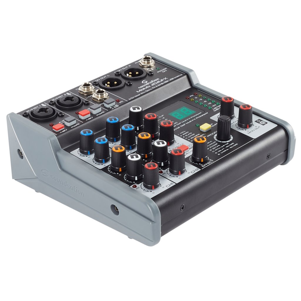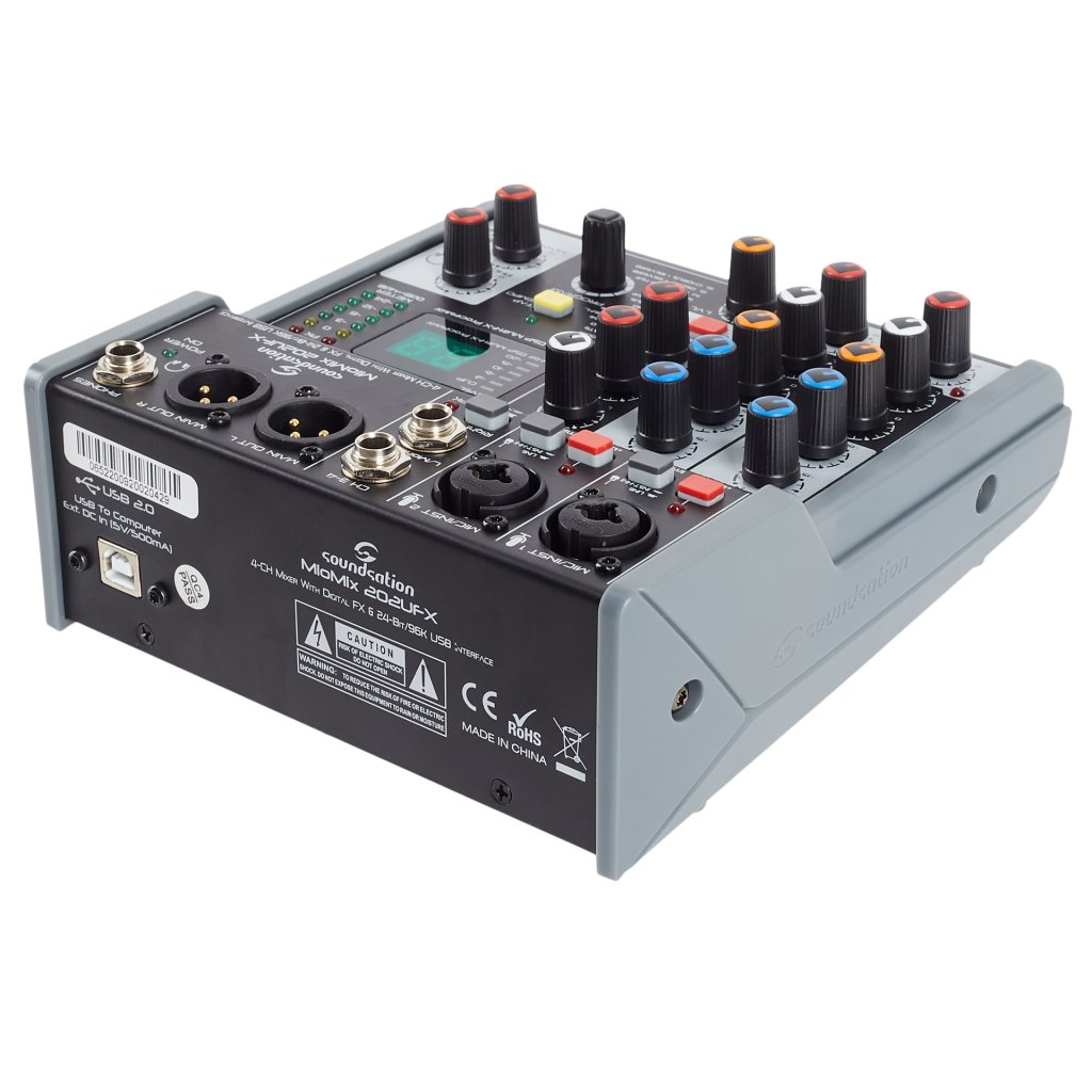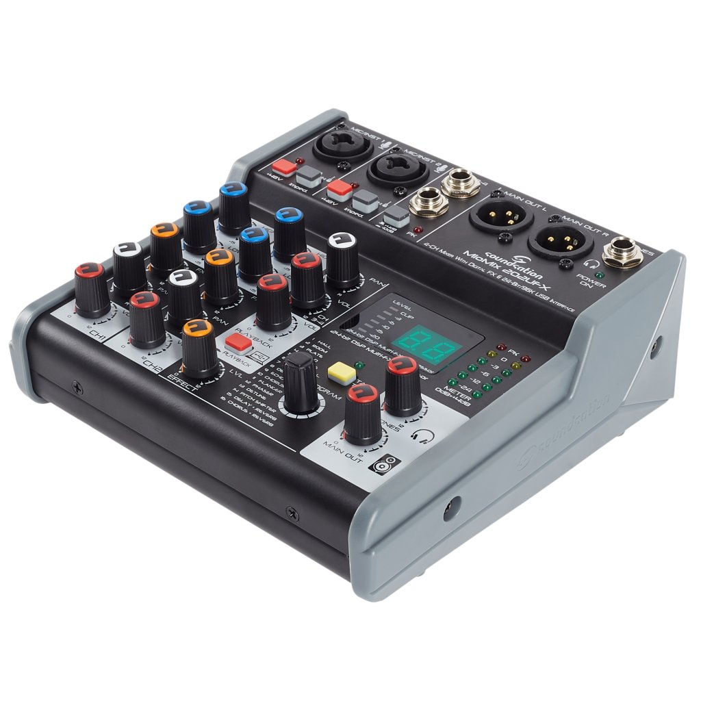 Miomix 202UFX je štvorkanálový mixážny pult s dvoma kombinovanými vstupmi XLR/TRS (tu môžete pripojiť mikrofóny, elektrifikované nástroje alebo linkové signály), dvoma linkovými vstupmi, dvoma výstupmi XLR do PA, slúchadlovým výstupom na detailný monitoring. Každý kanál môžete nastaviť pomocou dvojpásmového ekvalizéra, nastaviť panorámu a môžete tiež primiešať signál z jednotky FX. K dispozícii je fantómové napájanie pre kondenzátorové mikrofóny. Prehľad o nastavení získate prostredníctvom šesťúrovňového LED indikátora a podsvieteného displeja.