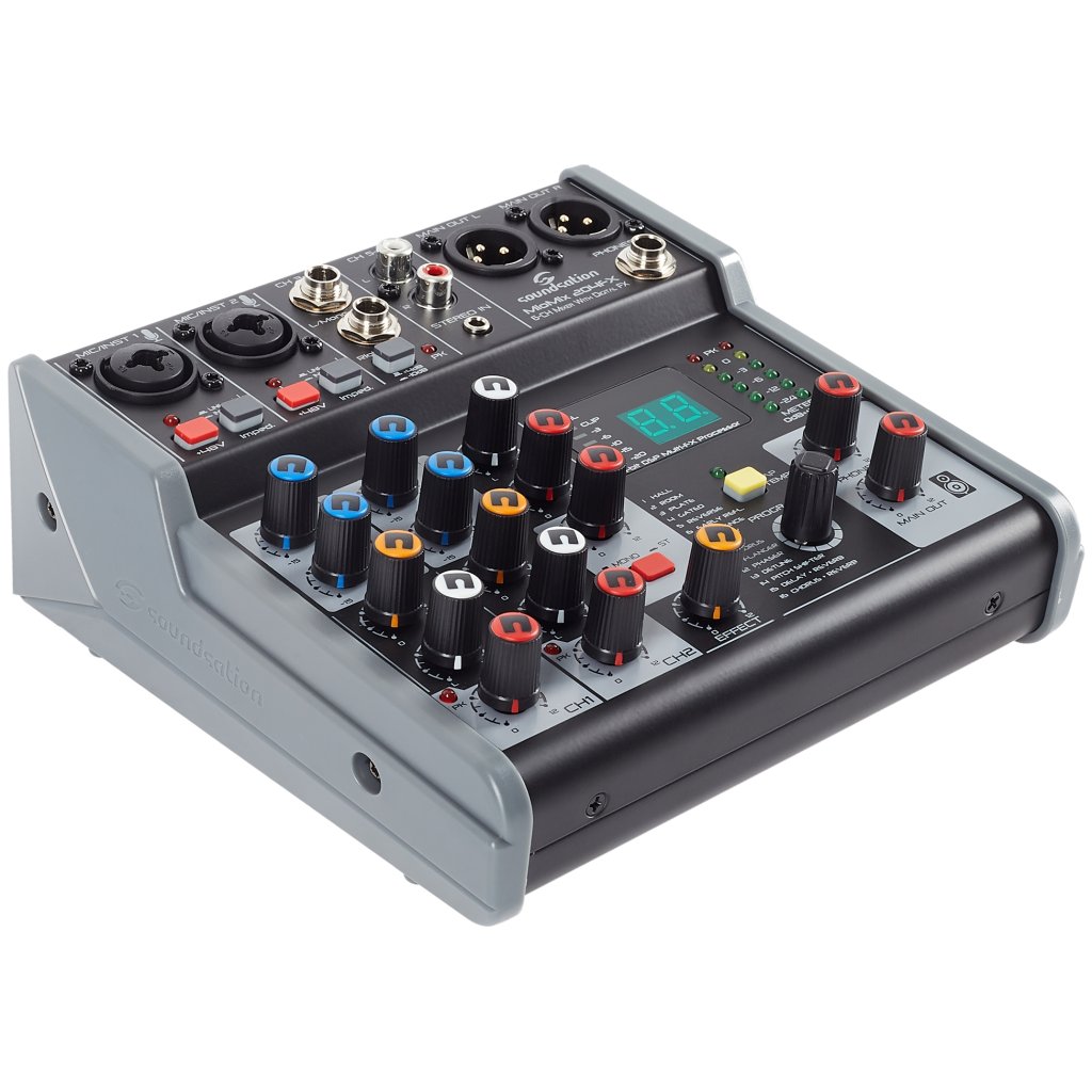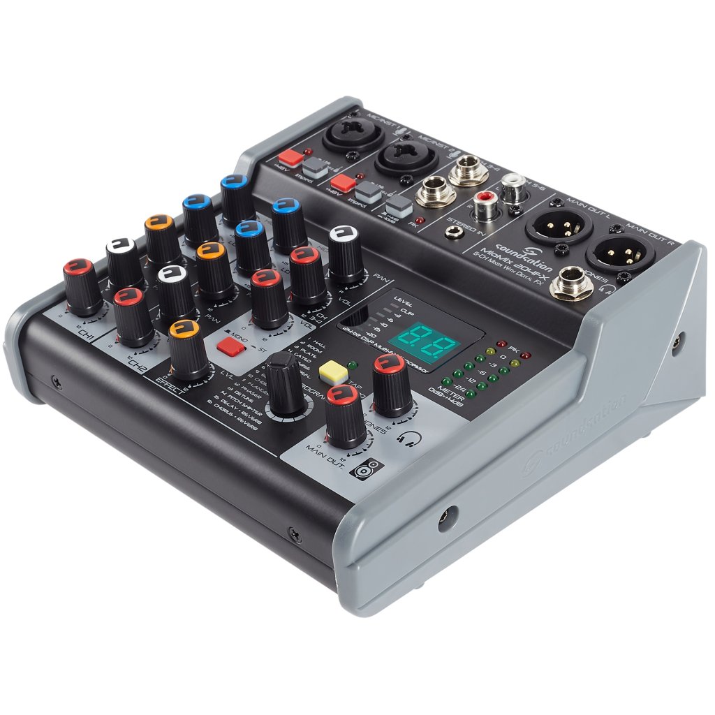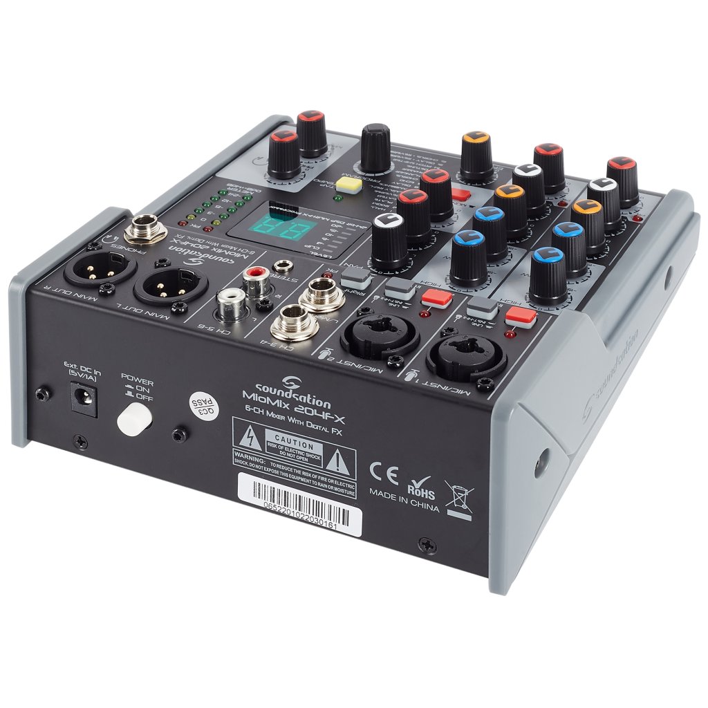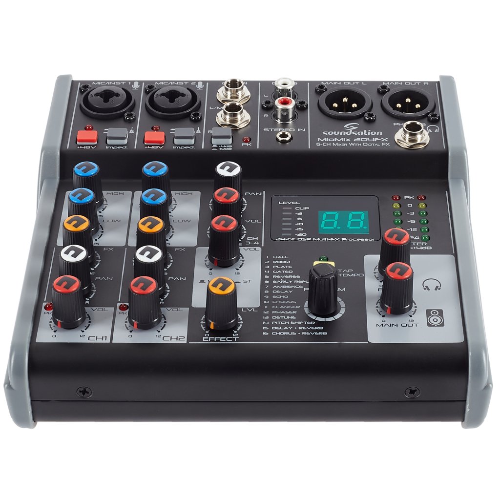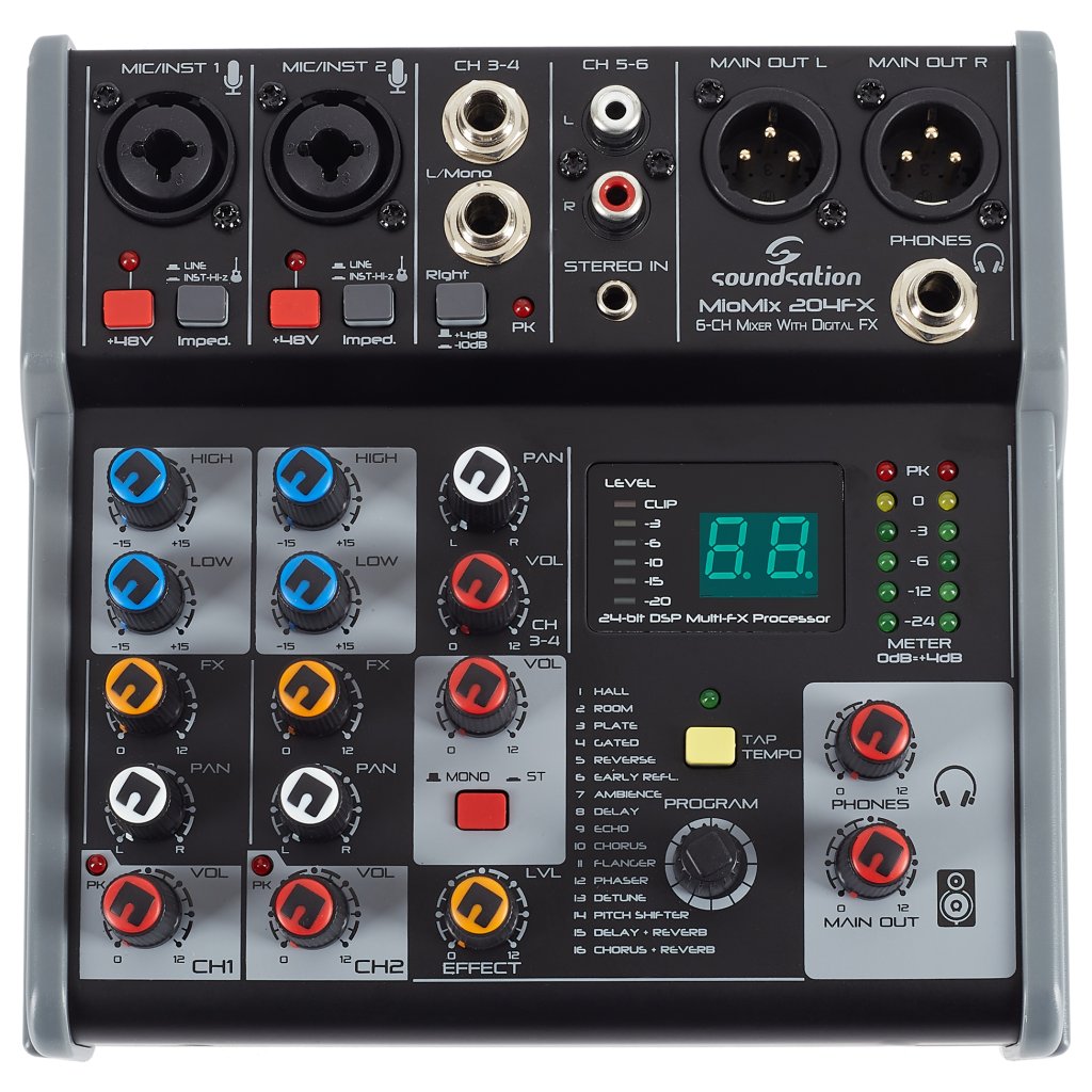 Miomix 204FX je šesťkanálový mixážny pult s dvoma kombinovanými vstupmi XLR/TRS (tu môžete pripojiť mikrofóny, elektrifikované nástroje alebo linkové signály), štyrmi linkovými vstupmi (2x Jack, 2x RCA / stereo Jack) , dvoma výstupmi XLR do PA, slúchadlovým výstupom na detailný monitoring. Kanály 1 a 2 je možné nastaviť pomocou dvojpásmového ekvalizéra, všetky kanály je možné panorámovať a môžete tiež primiešať signál z jednotky FX. K dispozícii je fantómové napájanie pre kondenzátorové mikrofóny. Prehľad o nastavení získate prostredníctvom šesťúrovňového LED indikátora a podsvieteného displeja.