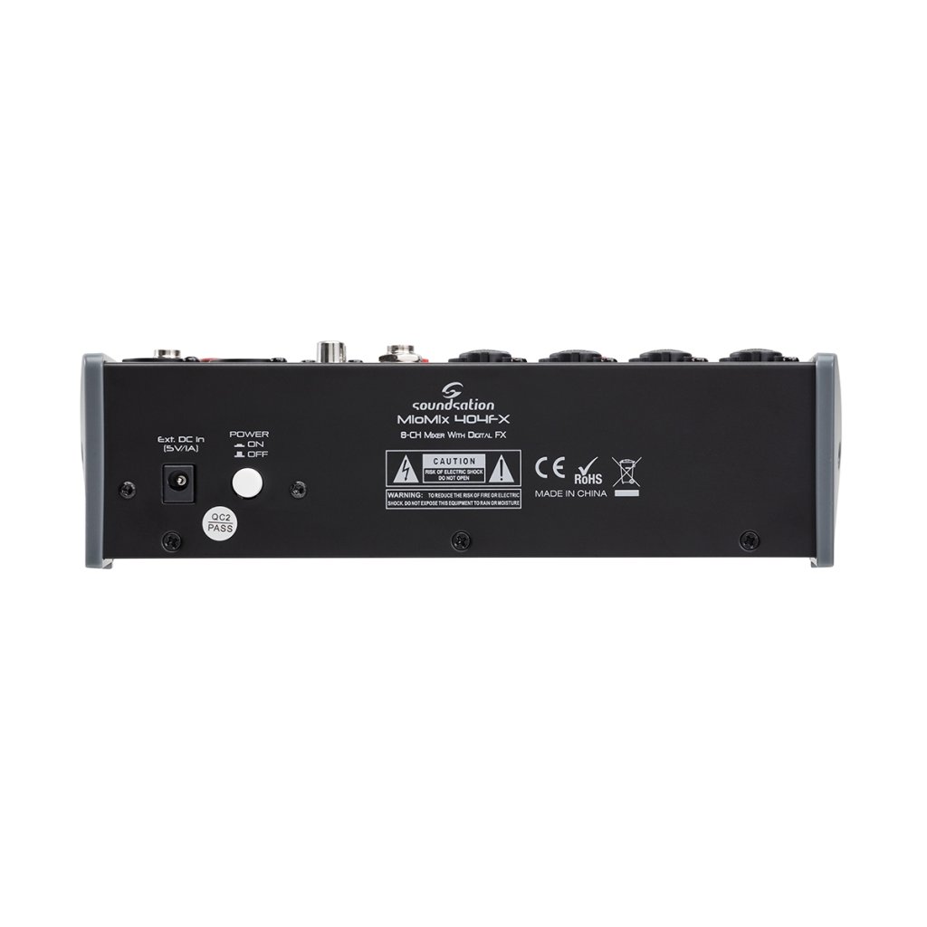 Miomix 404FX je osmikanálový mixážní pult se čtyřmi kombinovanými XLR/TRS vstupy (zde připojíte mikrofony, elektifikované nástroje či linkové signály), čtyřmi line vstupy (2x Jack, 2x RCA / stereo Jack) , dvěma XLR výstupy do PA, sluchátkovým výstupem pro detailní monitoring. Kanály 1 - 4 můžete upravit dvoupásmovým ekvalizérem, všem kanálům nastavíte panoramu a můžete také přimíchat signál z FX jednotky. Nechybí fantomové napájení pro kondenzátorové mikrofony. Přehled o vašem nastavení získáte prostřednictvím šesti úrovňového LED ukazatele a podsvíceného displeje.