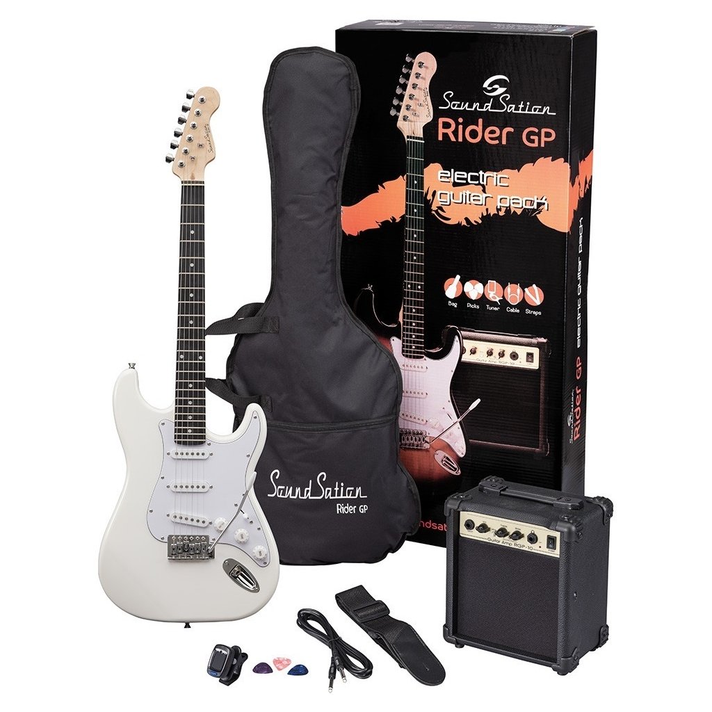 SOUNDSATION RIDER GP VW ELECTRIC GUITAR PACK obsahuje všetko potrebné pre začínajúcich hudobníkov. Konkrétne elektrickú gitaru v tradičnom ST štýlovom prevedení s tromi single-coilmi, kombo elektrickej gitary RGB-10 s výkonom 10 W a výstupom na slúchadlá, klipovú ladičku, gitarový popruh, nástrojový kábel, trsátka a gig bag.