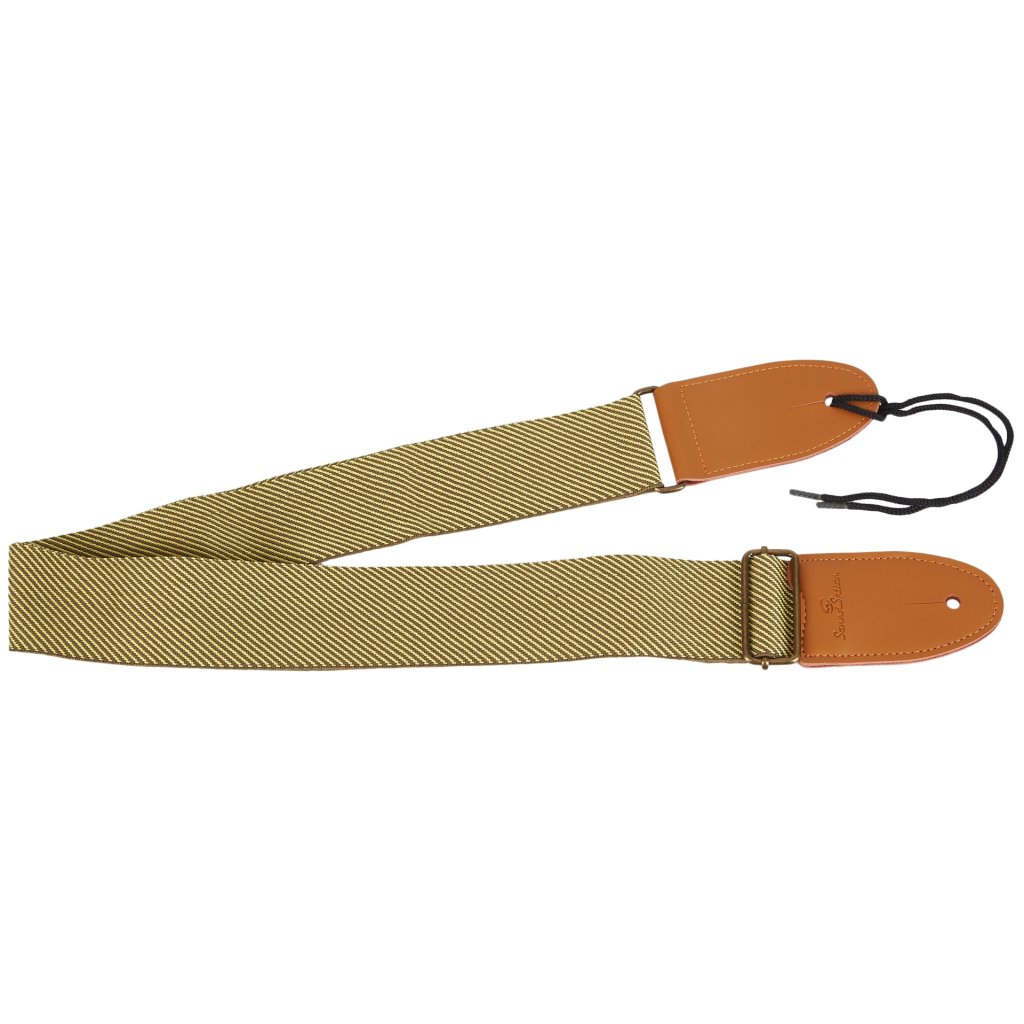 Popruhy od talianskej spoločnosti Soundsation potešia začiatočníkov aj pokročilých hráčov svojím vizuálnym dizajnom a kvalitnými materiálmi a sú vhodné pre širokú škálu nástrojov. Tento model je vyrobený z päť centimetrov širokého tvídu, ktorý je veľmi pohodlný a odolný. Dopĺňajú ho robustné konce z pravej kože a mosadzné kovania, vďaka ktorým popruh ponúka vintage estetiku, ktorá je v súčasnosti taká populárna. Samozrejme, dĺžku možno nastaviť až do 150 centimetrov.