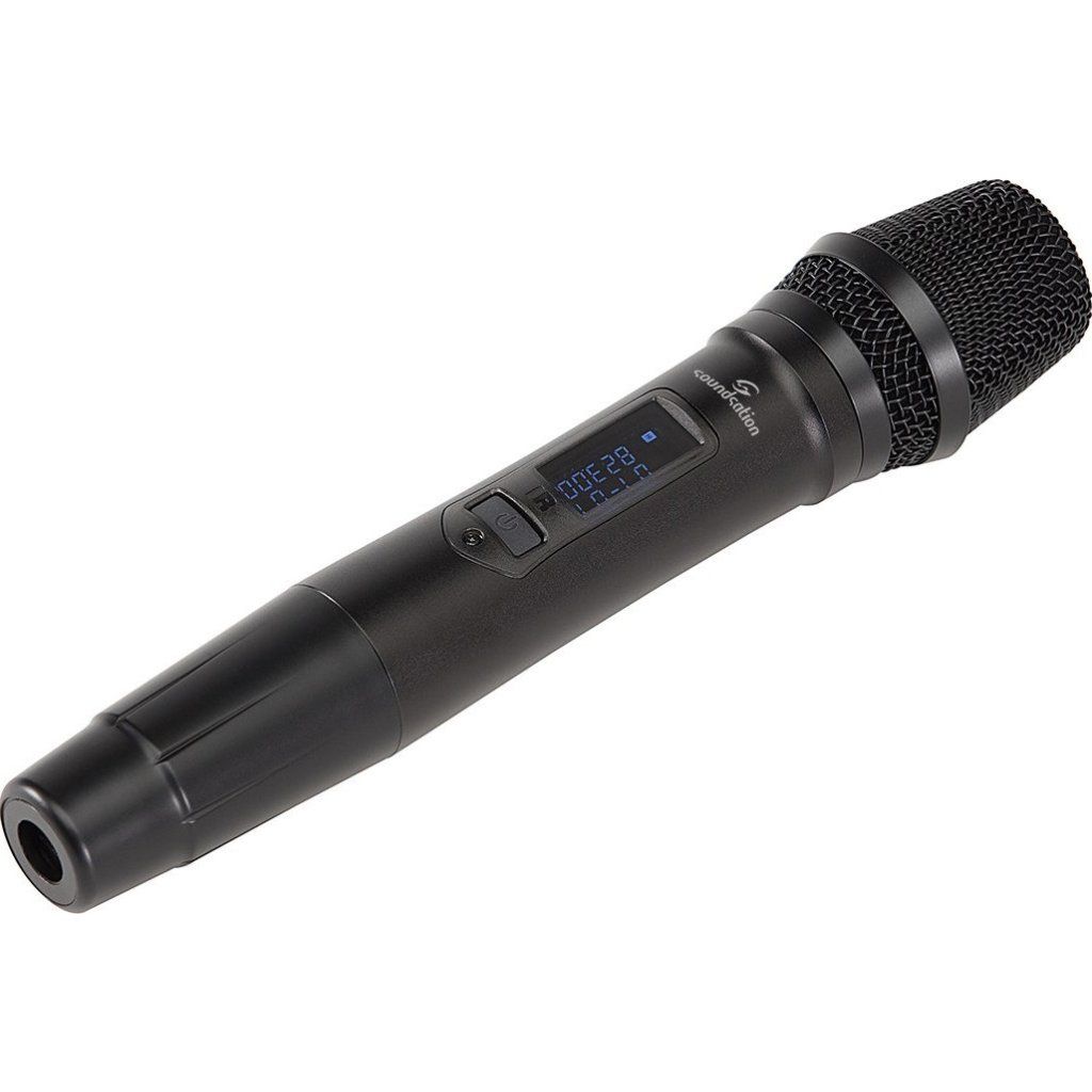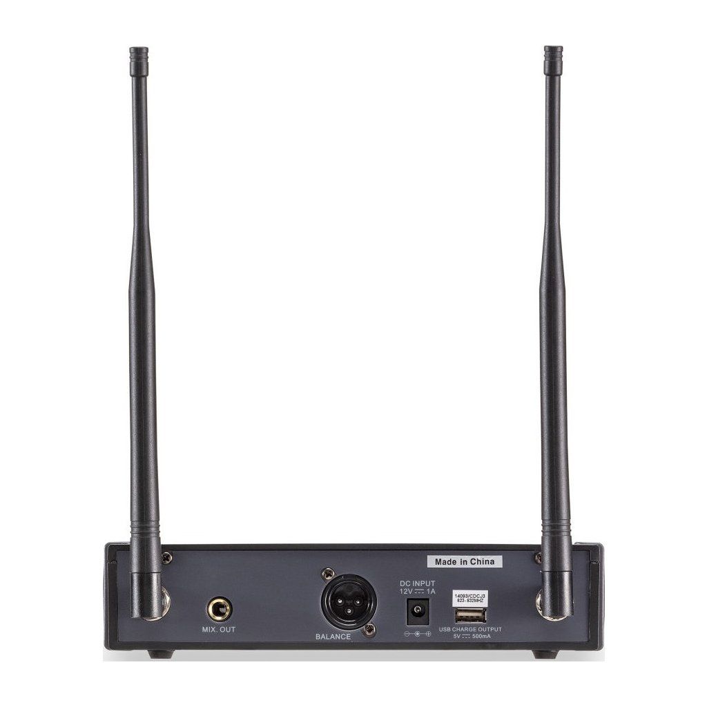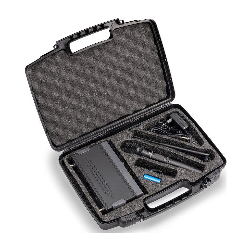 Súčasťou systému je profesionálny ručný mikrofón vybavený dynamickou kardioidnou kapsulou, ktorá poskytuje vysokú odolnosť proti spätnej väzbe a jasnú artikuláciu hlasu. Mikrofón má nabíjateľnú lítiovú batériu, ktorú možno pohodlne nabíjať cez USB port na zadnom paneli prijímača. Ideálna pracovná vzdialenosť je až 50 metrov bez prekážok.