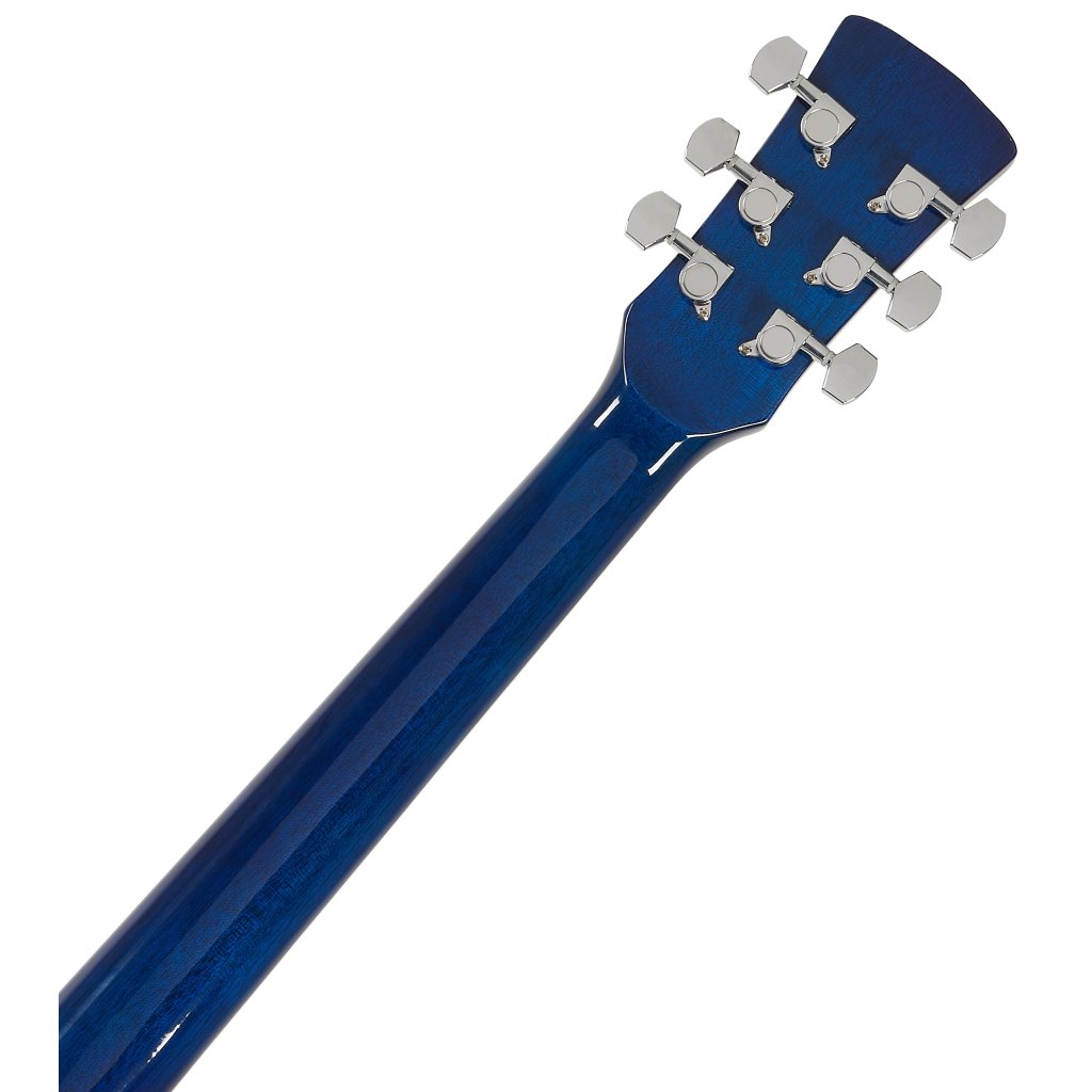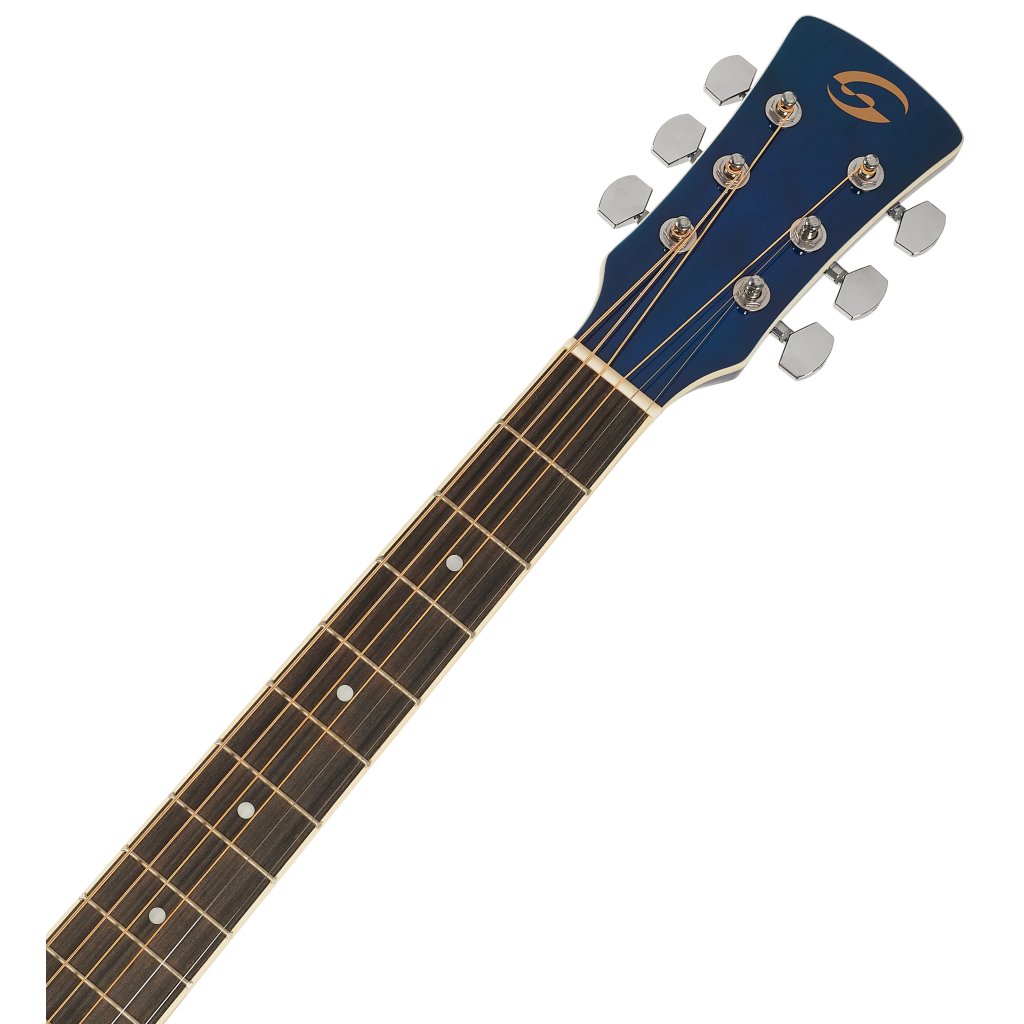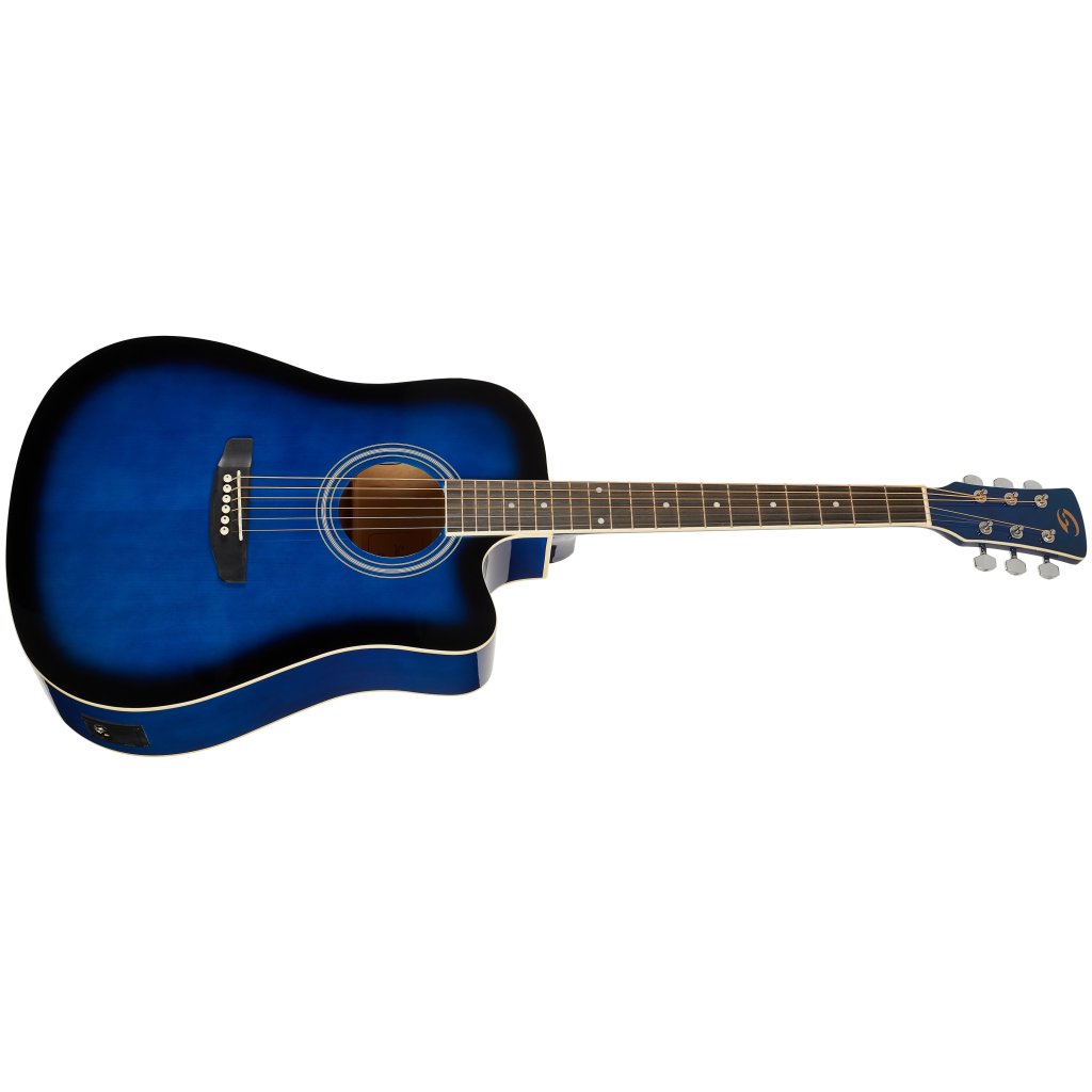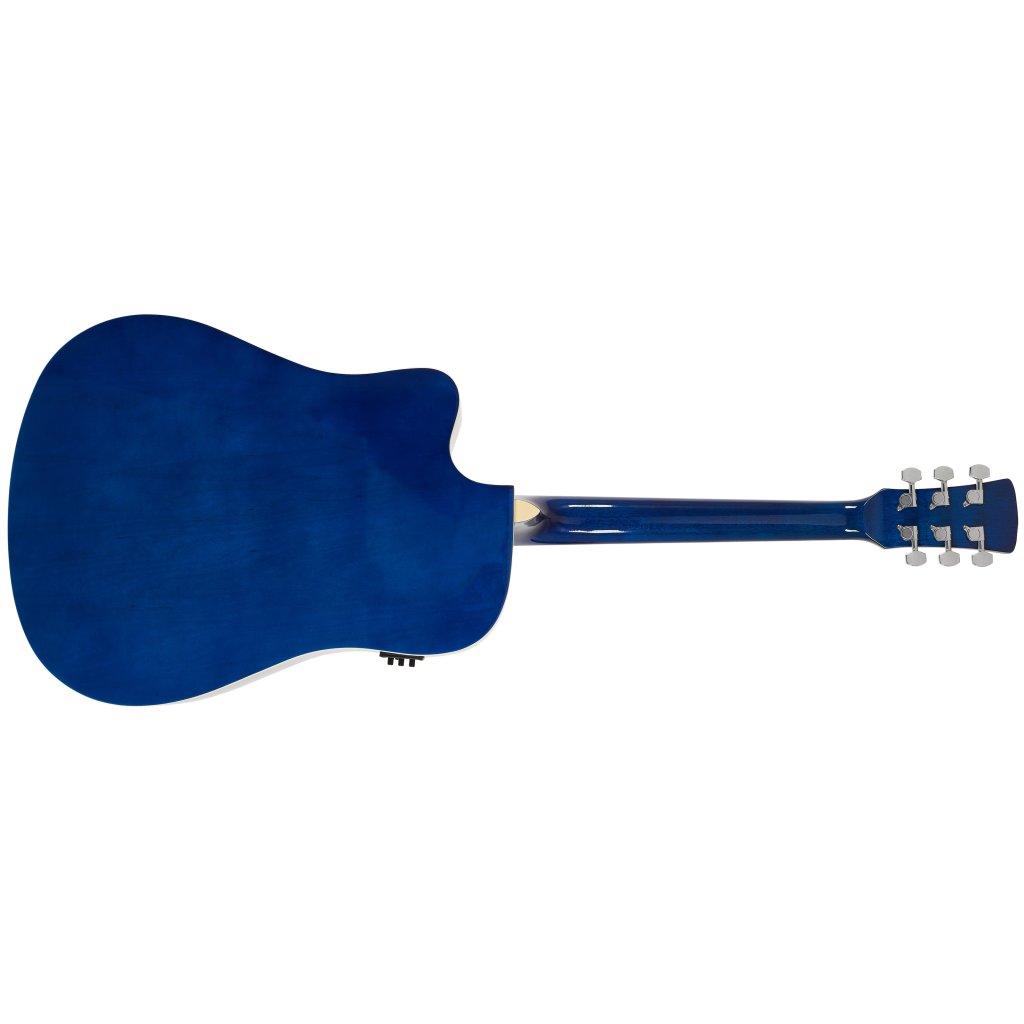 Přední deska elektroakustické kytary YELLOWSTONE-DNCE-BLS je zhotovena z překližovaného smrku, zadní deska a luby jsou vyrobeny z překližované lípy. Hmatník z blackwoodu je osazen dvaceti pražci, orientaci na hmatníku usnadňují poziční tečky. Struny jsou uchyceny v chromovaných die-cast ladících mechanikách a kobylce z blackwoodu. Stylové zpracování podtrhuje obvodová lemovka těla, krku a hmatníku, finiš blue burst a černý pickguard.