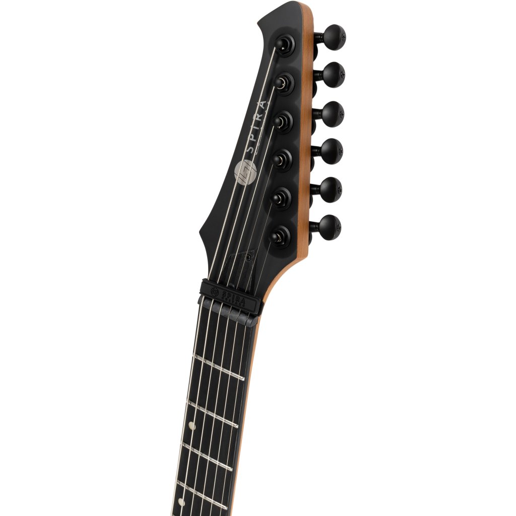 Spira Guitars ponúka cenovo dostupné elektrické gitary s moderným dizajnom a výkonnými snímačmi pre hráčov tvrdých a ťažkých štýlov. Ide o projekt ľudí z tábora Jet Guitars, značky známej výrobou "lacných" gitár v tradičnom dizajne. V prípade Spira Guitars sa počíta len so šťavnatým high-gain skreslením a "full chugom". Elektrická gitara T-400 Baritone MBK je moderný nástroj s jedným výrezom v štýle T a dlhšou menzúrou (686 mm). Dlhší krk umožňuje ľahko tolerovať výrazne nižšie ladenie. Má telo z praženého topoľa, krk z kanadského javora s profilom Modern D a moderný ebenový kompozitný hmatník s dvadsiatimi štyrmi jumbo pražcami. Vďaka tepelnej úprave tela a krku je drevo gitary stabilnejšie. Dva patentované humbuckery Spira Villain s keramickými magnetmi a silnejším výstupom dodávajú gitare šťavnatý zvuk, ktorý oceníte najmä pri nastavení high-gainu. S nastaveniami zvuku možno manipulovať pomocou štandardných gombíkov. Struny sú uchytené vo firemných ladiacich mechanikách a cez pevný most cez telo. Štýlovú povrchovú úpravu podčiarkuje matný lak a čierny hardvér.