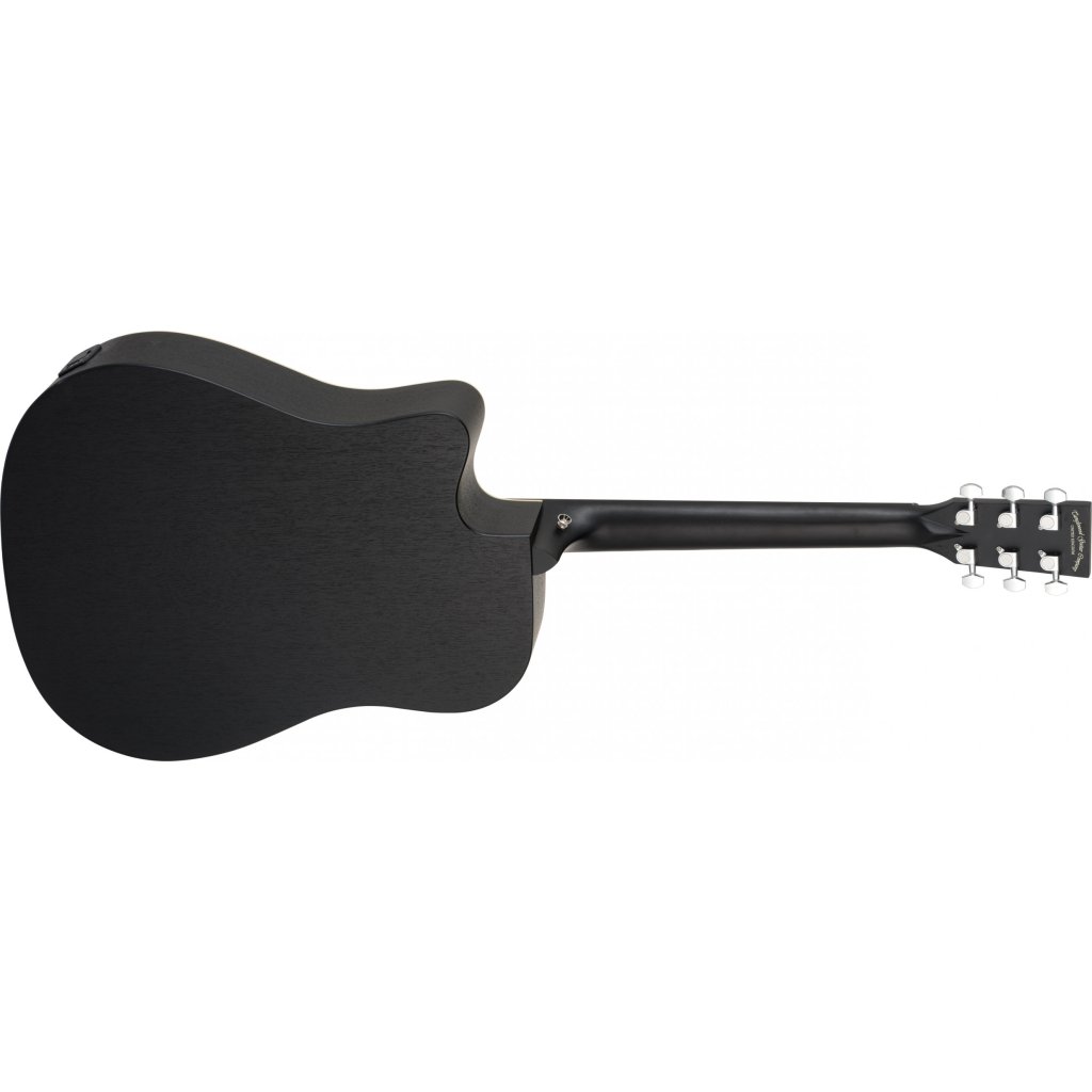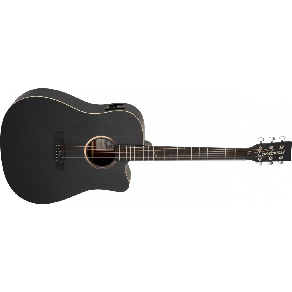 Tanglewood Blackbird TB5CE je klasická westernová gitara, t. j. dreadnought s hranatými ramenami a výrezom. Má robustné telo z laminovaného afrického mahagónu, mahagónový krk a hmatník z moderného kompozitného materiálu. Struny sú upevnené na chrómových liatinových ladiacich mechanikách a kompozitnom mostíku. Štýlový povrch zdôrazňujú dekoratívne intarzie na dvanástom pražci, béžové lemovanie, drevená rozeta a povrchová úprava Smokestack Black Satin.
