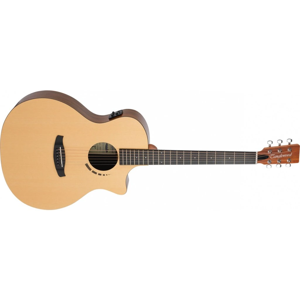 Tanglewood TM6CE je elektroakustická gitara zo série Metropolitan s moderným dizajnom tela Grand Auditorium, ktorý oceníte pri hre prstami alebo trsátkom. Samotné telo je vyrobené z vysoko odolného laminátu HPL v prevedení smrek (predná strana) a havajské koa (zadná strana a boky). Vďaka použitiu laminátu HPL je nástroj mimoriadne odolný voči zmenám počasia a vlhkosti. Spodný výrez uľahčuje dosah na vyššie pražce.