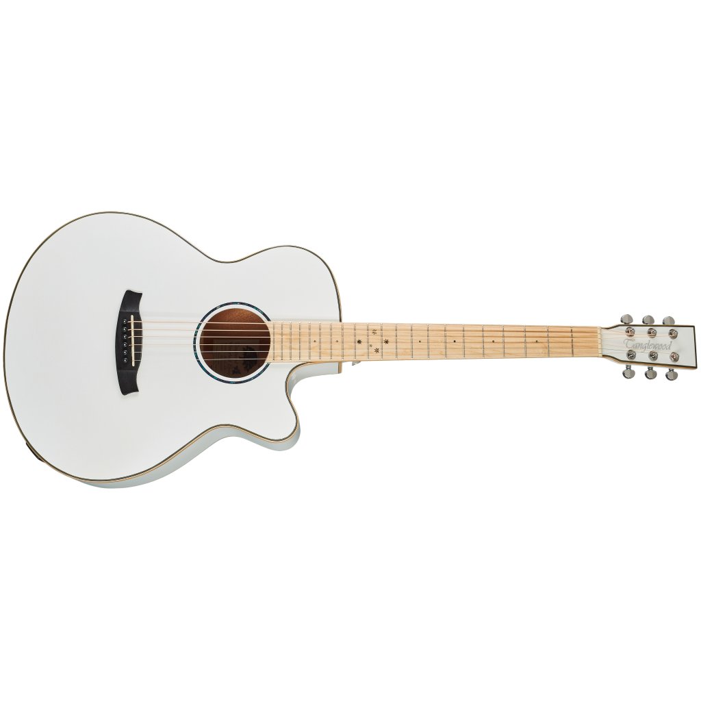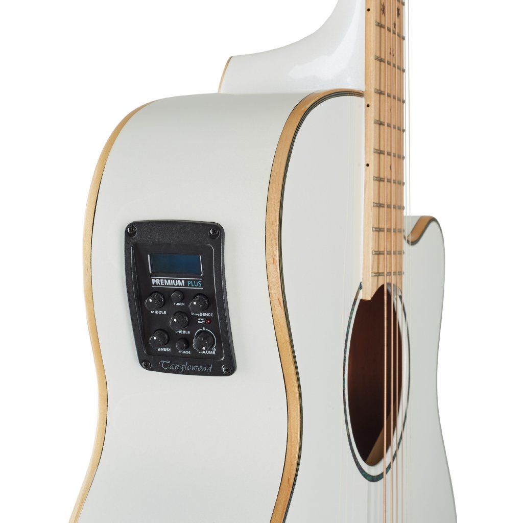 Britská značka Tanglewood predstavuje cenovo dostupnejšie akustické gitary v retro aj moderných designoch. TW4 CE BLW je elektroakustická gitara typu „Super Folk“, tj nástroj s užším a plytším telom, než ponúka napr. Dreadnought. Predná doska gitary je zhotovená z masívu mahagónu, zadná doska a luby mahagónu laminovaného. Ku krku z dreva nato, označovaného ako "eastern mahogany", je prilepený javorový hmatník osadený dvadsiatimi pražcami. Dohmat na vyšších polohách hmatníka uľahčuje praktický spodný výrez tela. Možnosť ozvučenia ponúka firemný preamp TW Premium Plus so štvorpásmovým ekvalizérom, funkciou Phase a integrovanou ladičkou. Struny sú cez nultý a sedlový pražec z materiálu NuBone uchytené v chrómovaných die-cast mechanikách značky Grover a kobylke z kompozitu. Pekné spracovanie podčiarkuje obojstranná javorová lemovka tela a farebný finiš tela Whitsunday White Gloss.