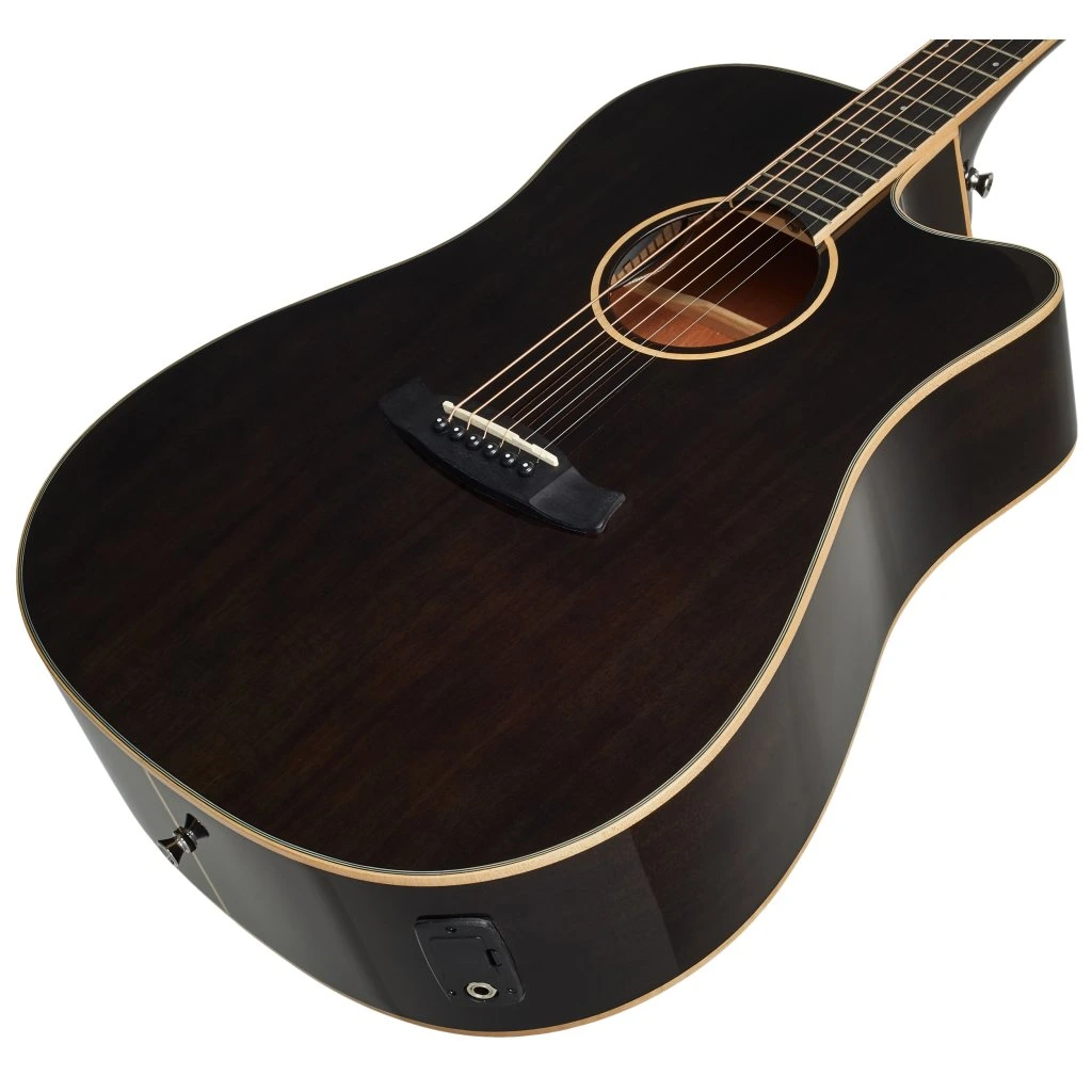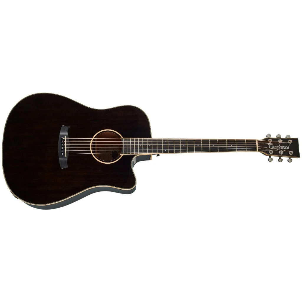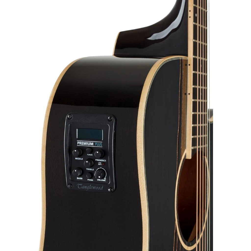 Britská značka Tanglewood predstavuje cenovo dostupnejšie akustické gitary v retro aj moderných designoch. TW5 CE BS je elektroakustická gitara s veľkým rezonantným telom typu Dreadnought z radu Winterleaf. Telo gitary je zhotovené z mahagónu - predná doska z masívu, zadná doska a luby z preglejkového mahagónu. Ku krku z dreva nato, označovaného ako "eastern mahogany", je prilepený hmatník z moderného kompozitného materiálu osadený dvadsiatimi pražcami. Dohmat na vyšších polohách hmatníka uľahčuje praktický spodný výrez tela. Možnosť ozvučenia ponúka firemný preamp TW Premium Plus so štvorpásmovým ekvalizérom, funkciou Phase a integrovanou ladičkou. Struny sú cez nultý a sedlový pražec z materiálu NuBone uchytené v chrómovaných die-cast mechanikách a kobylke z kompozitu. Pekné spracovanie podčiarkuje javorová lemovka tela a rozeta, stredový prúžok na zadnej doske, perleťové pozičné bodky (MoP) a finiš prednej dosky Black Shadow Gloss.