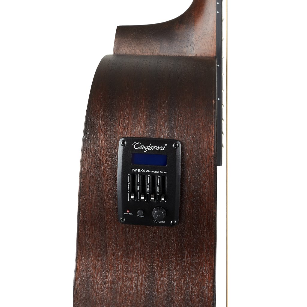 Tanglewood Crossroads TWCR O E je elektroakustická gitara s kompaktnejším tvarom tela Orchestra (OM). Telo gitary je vyrobené z laminovaného afrického mahagónu. Krk je k telu pripevnený na štrnástom pražci, povrch hmatníka z kompozitného materiálu je rozdelený dvadsiatimi pražcami a orientačnými polohovými bodmi. Struny sú osadené chrómovými Die-Cast mechanikami a kompozitným hmatníkom. Vintage dojem a pocit z nástroja umocňuje povrchová úprava Whiskey Barrel Burst Satin na vrchnej doske.