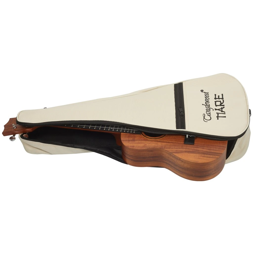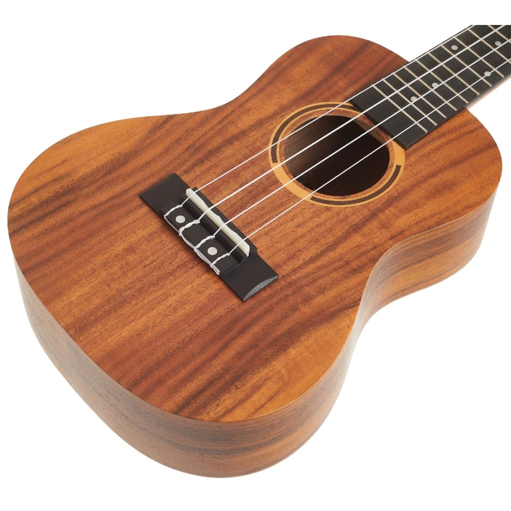 Struny sú uchytené v pochrómovaných ladiacich mechanikách gitarového typu a kompozitnom hmatníku. Pekné spracovanie podčiarkuje rozeta zložená z javorových a mahagónových krúžkov. Ukulele sa dodáva v gig bagu.