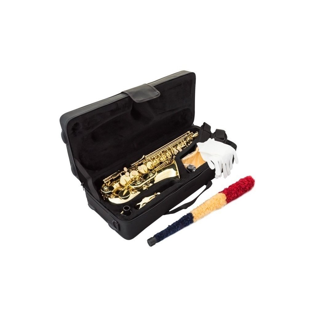 Eb alt saxofón - študentský model určený pre úplnych začiatočníkov. Telo nástroja je vyrobené z mosadze v zlatolakovom prevedení. Má modernú mechaniku pre pohodlnú hrateľnosť, F#3 klapku, pevne umiestnenú opierku pravého palca. Súčasťou balenia je pevné púzdro, nákrčník, leštiaca handrička, leštiace rukavice, hubička s ligatúrou, plátkom a krytkou.