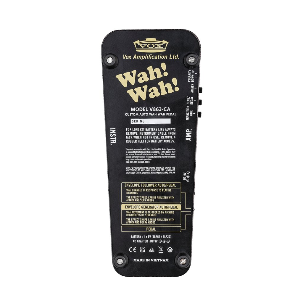 Na rozdiel od bežných auto-wah pedálov, ktoré využívajú upravené obvody VCF analógových syntetizátorov, využíva V863-CA inovatívnu konštrukciu, ktorá priamo riadi induktor pedála v reakcii na váš vstupný signál. Výsledkom sú automatické režimy s ikonickým wah tónom, ktorým je VOX povestný.