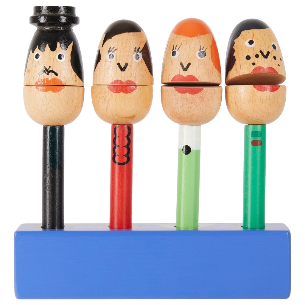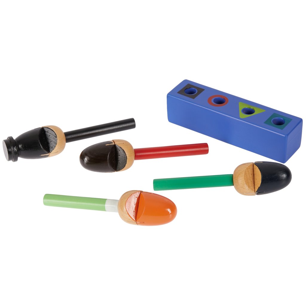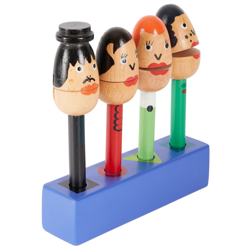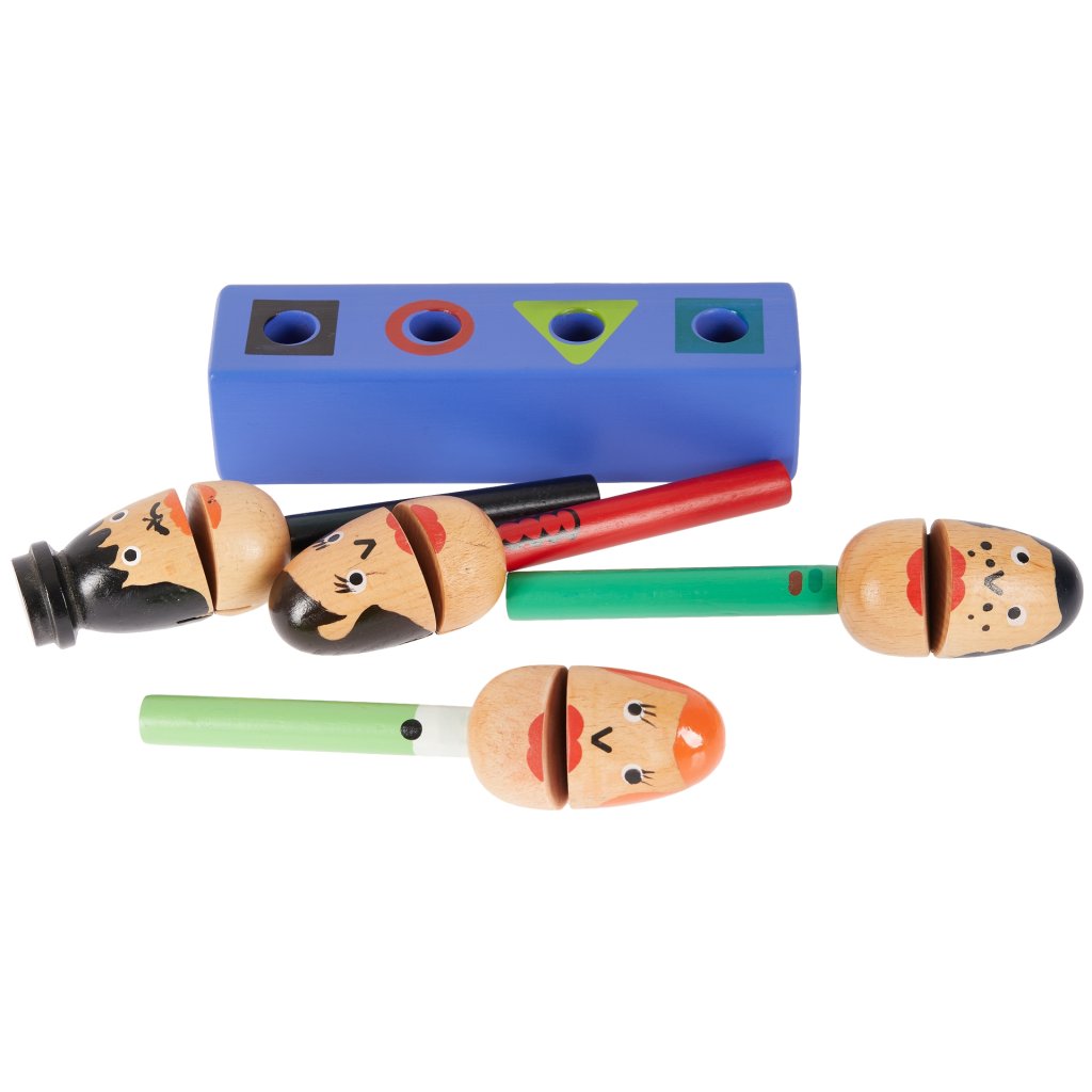 Súprava štyroch kastanet s motívmi postáv a dreveným stojanom. Vďaka pridanej tyči ich ľahko uchopia aj malé deti.