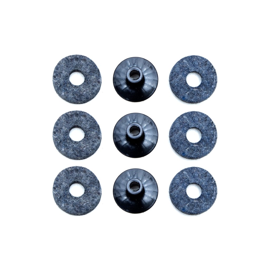 Praktická sada troch plastových a šiestich plstených činelových podložiek.